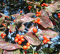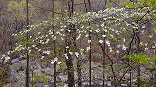 Native Dogwood, Cornus florida. Always white, and not to be confused with imported varieties. The fall fruits of the native tree are an important food for migrating song birds, unlike those of non-native species. The flowers are two to three inches across and bloom late April to early June in our region.