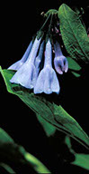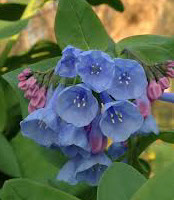 Bluebells or Virginia Bluebells, Mertensia virginica, is a perennial native to eastern North America from the southern Appalachians to Canada. It comes into bloom just as the first trees sprout leaves, and is usually finished blooming by late April or early May. The one to two foot arching stems have hanging clusters of lavender-blue flowers. Bloom size is one inch.