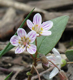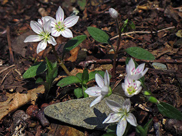 Carolina Spring Beauty, Claytonia caroliniana, a perennial native to eastern North America, blooms April into May in our region. The flower will fade, the seed pods ripen, and the above-ground part of the plant will disappear by early June. The plant overwinters as corms. It can be distinguished from the common Spring Beauty (above) by its broad leaves.