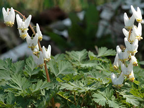 Dutchman's Britches, Dicentra cucullaria, is a perennial native to North America east of the Rockies except for the deep south. It has fern-like leaves and with multiple white flowers hanging from six to 10 inch long stems. The flowers are about an inch across, and have two lobes. The plant is insect polinated, and it's seeds distributed by ants. Blooms before the tree leaves come out.