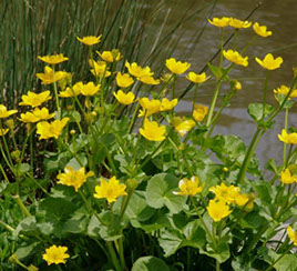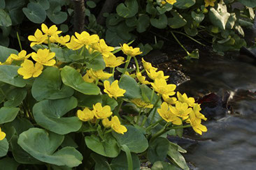 Marsh Marigold, Caltha palustris, a perennial native to most of North America except for the southern and Rocky Mountain states. Nlooms are an inch or more across, mostly with five petals, but occasilnally with four or up to nine. It has rich green glossy heart to kiudney shaped leaves, and grows in damp, swampy areas and along streams.