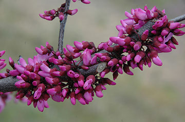 Eastern Redbud, Cercis canadensis, is a large deciduous shrub or small tree, native to eastern North America from Southern Ontario, Canada south to northern Florida. Its range extends west almost to the Rockies. In the wild it is generally an understory tree in mixed hardwood forests. It blooms before its leaves and the leaves of the forest trees appear, and may continue in bloom for some weeks. The flowers appear first as red-magenta beads all along the branches and the trunk.