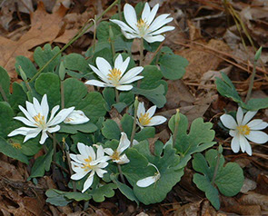 Bloodroot, Sanguinaria canadensis, is a perennial native to North America east of the Rockies. It has white flowers up to an inch and a half across, with eight to ten petals. The flowers bloom before the trees leaf out, and continue to bloom through April into early May.