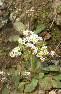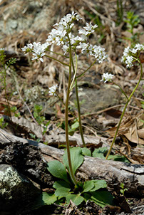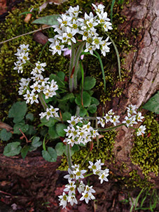 Early Saxifraga, Saxifraga virginiensis, Micranthes virginiensis, is an early blooming perennial native to eastern and central North America. It likes rocks, cliffs and logs. The plant grows to about 18 inches tall, ands has clusters of tiny white flowers that may be flecked with yellow.
