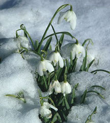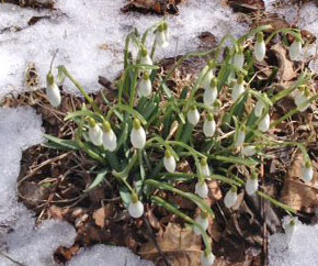 Snowdrop, Galanthus nivalis, and related species. These are introduced perennials native to Europe. They are likely to be the first flowers that bloom each year. They appear in in our area during the last days of winter or very early spring, often while snow is still on the ground.