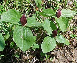 Toadshade, Red Trillium, Trillium sessile, a perennial native to the central part of the eastern United States and the Ozarks. It has a single red flower with a foul scent that grows directly from the middle of its three leaves.