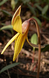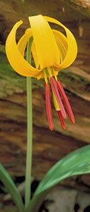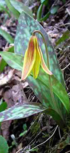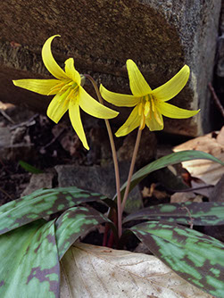 Trout Lily, Yellow trout Lily, Erythronium americanum, is a perennial native to eastern North America from the Atlantic to the Mississippi, and from Georgia north into Canada. It has one-inch yellow flowers, with three petals and and three petal-like sepals that curl upward. Each plant has a single flower stem with a pair of blade-shaped green leaves mottled with brown spots. Generally blooms before the tree leaves open.