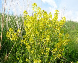Wintercress or Yellow Rocket, Barbarea vulgaris, a Eurasian native now common across North America. Tufted plant with elongated clusters of small bright yellow flowers atop erect leafy stems. Frequently forms showy yellow patches in open fields. Bloom size about a third of an inch. Blooms April into summer. Originally introduced by early European settlers to provide a scurvy-curing early spring green, the plant is ediable. Very fragrant, and long-lasting as a cut flower.