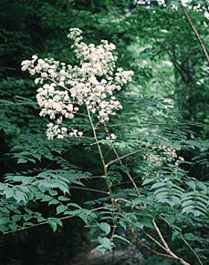 Devil's Walking Stick, Hercules' Club or Prickly Ash, Aralia spinosa, a perennial native to eastern US that grows from six to 25 feet tall. Blooms in August in this area and fruits with berries in the fall. Noted for its thorny trunk. See Japanese angelica tree, Aralia elata, at the bottom of the page in the invasive species.