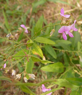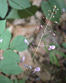 Panicledleaf or Narrowleaf Ticktrefoil, Desmodium paniculatum, a perennial of the pea family native to eastern north America that blooms with tiny flowers in late August or early September. If you have never noticed the plant, you have undoubtly notices the seed podss: tiny triangles that tenaciously adhere to clothing and hair.