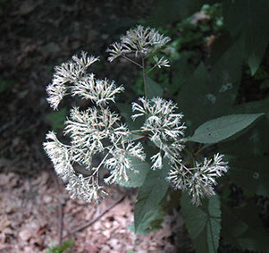 White Snakeroot, Ageratina altissima, syn. Eupatorium rugosum, a shade and moisture loving perennial native of eastern and central North America. Grows 1.5 to 3 foot high. It is toxic to humans and animals, and dairy animals that graze on it can concentrate it and produce milk harmful or even lethal to humans. Blooms through fall.