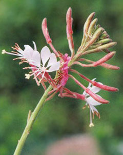 Biennial Beeblossom or Biennial Gaura, Gaura biennis, is a biennial plant related to evening primrose native to the eastern US. The first year it produces no flowers, the second year it takes off and produces clusters of small, pink to white blooms on thin stalks that may reach six ot seven feet high. The flowers are less than a half inch across and have four petals. They open in the morning and may be withered by afternoon. An good food source for butterflies and bees. The spindly stalks swaning in the breeze scatter seeds. Blooms mid-August into September.