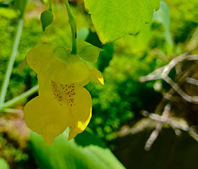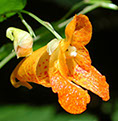 Jewelweed, Spotted Jewelweed, Orange Jewelweed and Touch-me-not are all names for Impatiens capensis, a native North American annual plant with juicy, glassy stems. Dermatological studies have confirmed that crushed jewelweed stems are effective in mitigating contact with poison ivy if applied after contact, followed by rinsing with water. Soap works better, but then few of us carry soap on day trips. Blooms late July into September in our region. May be almost all orange or almost all yellow. The similar Pale Jewelweed, Impatiens pallida, shown below, often grows side by side.