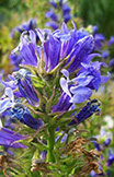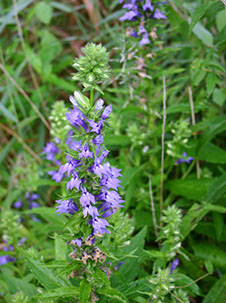 Great Blue Lobelia, Lobelia siphilitica, native to eastern and central North America, is a short-life perennial (lives just a few years) that blooms August well into fall in our area. Grows up to three feet tall and prefers wet to very moist soil.