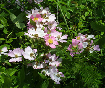 Native wild roses: The Virginia Rose, Rosa virginiana (left) , and the Field Rose, Rosa arvensis. Both are perennials native to eastern North America. The former is a bush or shrub that likes full sun and has many thorns, and may grow to six feet or more tall. The latter prefers woodland verges and field edges and climbs on other plants and fences, and has far fewer thorns. Both have white to pink flowers with five petals about two inches across. Both bloom late May through most of summer, and produce bright red rose hips.