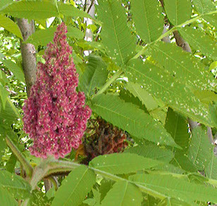 Staghorn Sumac, Rhus typhina, is a flowering and fruiting perennial deciduous shrub that grows as high as 15 foot tall, It native to northeastern United States, adjoining parts of Canada, and south along the Appalachian spine. It flowers largely unoticed in May and June, but by late July and through fall bears conical clusters of deep red fruit that have the appearence of flowers. This fruit can be mashed and soaked in cold (not hot) water for four to eight hours, strained or filtered, and sweetened to make a delicious beverage. Staghorn sumac is not at all related to poison sumac. In the fall the leaves of this plant turn brilliant red, yellow and orange before dropping. Photos show flower, ripe and dried fruit.