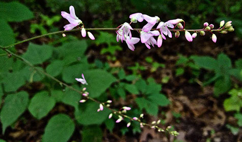 Tick Trefoil, Desmodium glutinosum, Is a perennial native to eastern North America that blooms in August with tiny pink flowers along a stalk that may be two foot long or longer.