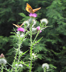 Problem invasive species: Bull Thistle, Cirsium vulgare, a Eurasian native that is spiny and highly toxic. Somewhat less aggressive and invasive than the Canada Thistle, but still a problem.