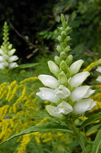 Turtlehead, Chelone glabra, is a perennial native to eastern North America from Canada almost to the Gulf Coast. Grows along river banks and in wetlands, and grows from one to four foot tall before blooming. Flowers from late July into September. A favorite food of deer.