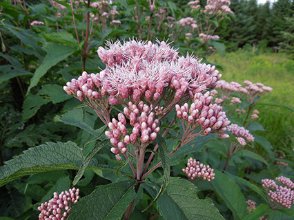 Joe Pye Weed, Eutrochium maculatum, is native to northeastern and north central North America as far south as Kentucky. This perennial grows as tall a five or six feet, and favors moist to wet soil and full sun. Its native habitate is marshes, but it does well in roadside drainage ditches. In our area, blooms late July into fall.