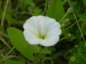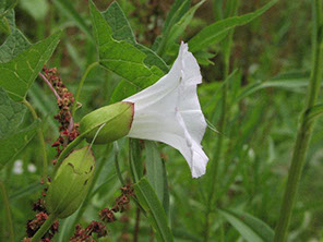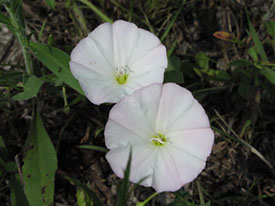 Field Bindweed (above), Convolvulus arvensis. Introduced in the mid 1700s as a crop seed contaminant. Blooms June through fall. This is wild morning glory, so the flowers will close and wither as the day progresses. Flowers that range from pure white to heavily colored or streaked with pink and lavender.