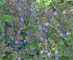 Ground Ivy, Glechoma hederacea, naturalized native of Europe and parts of Asia. Blooms May to July. Tiny flowers and lobed leaves.
