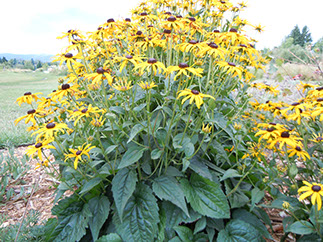 Blackeyed Susan, Rudbeckia hirta, North American native that blooms July into fall. It is an annual that likes moist meadows and woodland verges. Flowers are up to four inches across. The state flower of Maryland.