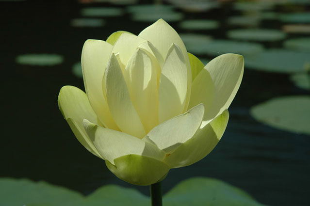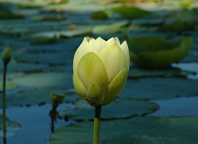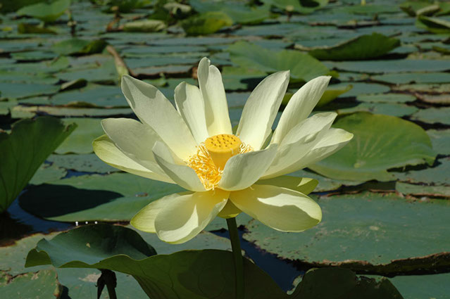 American Lotus, Nelumbo lutea, the largest flower native to North America and one of the largest in the world. Definitely not a water lilly, it's the closest living relative of the sycamore tree. Blooms July through fall.