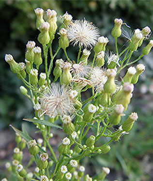 Horseweed or Canadian Horseweed, Conyza canadensis, is an annual native to most of North America except Alaska, Yukon and the the other far norther regions. It is now spread across most of the northern hemisphere. It does well in poor soils and is often found along the sides of roads. Usually it is eventually displaced by perennials, if they are allowed to grow. Flowers are less than dime sized, and the plant rarely more than three feet high.Blooms untill frost.