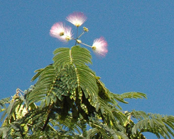 Problem invasive: Mimosa Tree, Albizia julibrissin, Is an Asian import, often planted for its beautiful flowers and foliage. It now grows wild in the US south of Massachusetts. It often bears seeds and flowers at the same time. Breeders are attempting to produce a seedless tree to make it more suitable for ornamental planting. It is fast growing small tree that is often a pioneer species in vacant lots and disturbed soils. Its main problem is that it displaces native species. Fortunately, it is plagued by fungal diseases in the eastern US, which keep it somewhat under control. Blooms summer through fall.