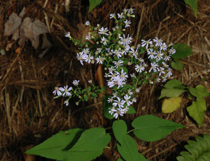 Blue Wood Aster, Symphyotrichum cordifolium, syn. Aster cordifolius, is a perennial native to eastern North America, found along woodland verges and in open areas. The pale blue to purple flowers bloom from mid-August through fall in our area. Flowers have 10 to 15 rays with a yellow to red center and can grow to four foot tall.