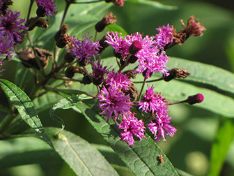 Ironweed: Vernonia altissima (tall Ironweed, left) , Vernonia noveboracensis, (New York Ironweed) and several other similar and related species are native to eastern North America and prefer moist to damp meadows. Altissima can reach 10 foot tall!