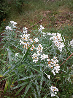 Pearly Everlasting, Anaphalis margaritacea, is native to most of North America, except for the region along the Gulf of Mexico. This perennial favors sunny, well drained locations, and its tiny white blossoms are beloved by butterflies and flower arrangers, who use it as a dried flower. Blooms August into fall.