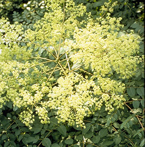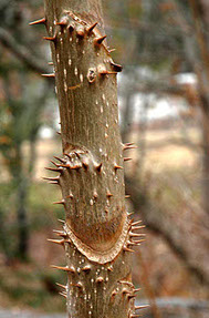 Devil's Walking Stick, Hercules' Club or Prickly Ash, Aralia spinosa, a perennial native to eastern US that grows from six to 25 feet tall. Blooms in August in this area and fruits with berries in the fall. Noted for its thorny trunk. See Japanese angelica tree, Aralia elata, at the bottom of the page in the invasive species.