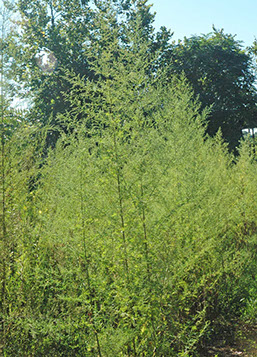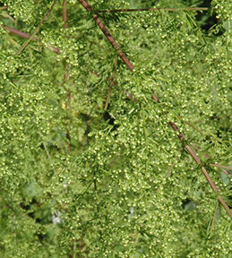 Sweet Annie, Sweet Wormwood, Artemisia annua, an annual native to Asia but now naturalized throughout much of the world. Tiny yellow flowers bloom in late August into September. This very fragrant plant is often picked and used for its scent. Has several uses in both tradatonal and modern medicine, particularly for treating malaria and cancer. Grows six or more feet high.