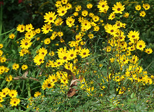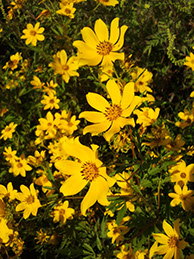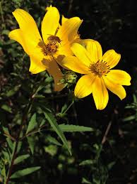 Tickseed Sunflower, Bidens aristosa, a native of eastern and central North America from southern Ontario to the Gulf Coast. A fast-growing annual with lots of two-inch flowers on plants up to five foot tall, it prefers full sun and moist soil. Blooms late July into September. Barbed seeds attach to clothing and hair, and are sometimes called beggers ticks. Flowers are similar to Jerusalem artichoke, Helianthus tuberosus, but leaves are narrow with serrated edges.