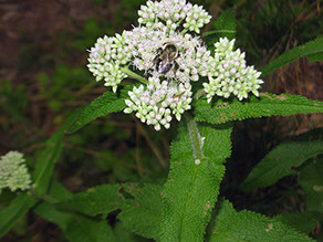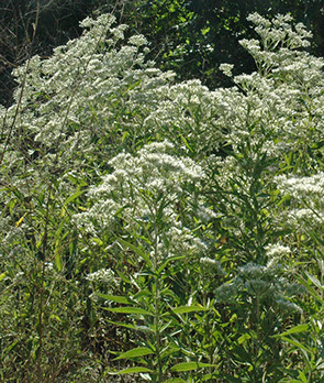 Boneset, Eupatorium perfoliatum, is a perennial native to North America east of the Rockies. It prefers damp soil, and blooms well into the fall. Grows up to three feet tall.