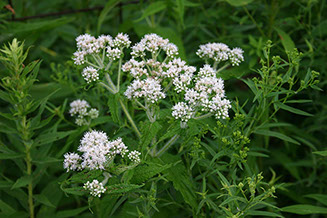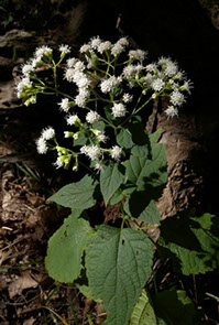 White Snakeroot, Ageratina altissima, syn. Eupatorium rugosum, a shade and moisture loving perennial native of eastern and central North America. Grows 1.5 to 3 foot high. It is toxic to humans and animals, and dairy animals that graze on it can concentrate it and produce milk harmful or even lethal to humans. Blooms through fall. Also see Boneset.