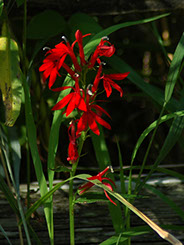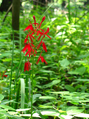 Cardinal Flower, Lobelia cardinalis, is a North American native that grows along stream banks and in marshes. It is common along undeveloped banks on the Delaware, Lehigh and Schuylkill Rivers, and can be found along most natural stream banks in our region that receive some sun. Blooms August into September. Plants may be up to four foot tall.
