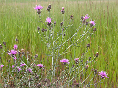 Problem invasive species: Spotted Knappweed, Centaurea maculosa, is a biennial eastern European native that first reached North America the 1800s as a seed contaminant. It out-competes native species by prolific seed production, a deep, water-sucking tap root, and by being inedible to grazing animals. Blooms August through fall in our area.