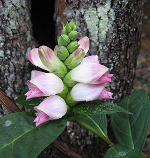 Turtlehead, Chelone glabra, is a perennial native to eastern North America from Canada almost to the Gulf Coast. Grows along river banks and in wetlands, and grows from one to four foot tall before blooming. Flowers from late July into September. A favorite food of deer.
