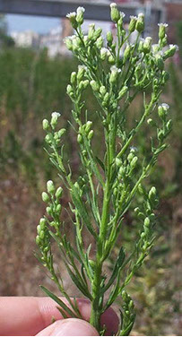 Horseweed or Canadian Horseweed, Conyza canadensis, is an annual native to most of North America except Alaska, Yukon and the the other far norther regions. It is now spread across most of the northern hemisphere. It does well in poor soils and is often found along the sides of roads. Usually it is eventually displaced by perennials, if they are allowed to grow. Flowers are less than dime sized, and the plant rarely more than three feet high.