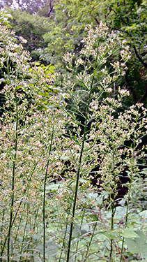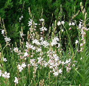 Biennial Beeblossom or Biennial Gaura, Gaura biennis, is a biennial plant related to evening primrose native to the eastern US. The first year it produces no flowers, the second year it takes off and produces clusters of small, pink to white blooms on thin stalks that may reach six ot seven feet high. The flowers are less than a half inch across and have four petals. They open in the morning and may be withered by afternoon. An good food source for butterflies and bees. The spindly stalks swaning in the breeze scatter seeds. Blooms mid-August into September.