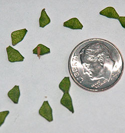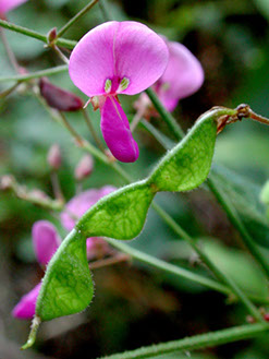 Panicledleaf or Narrowleaf Ticktrefoil, Desmodium paniculatum, a perennial of the pea family native to eastern north America that blooms with tiny flowers in late August or early September. If you have never noticed the plant, you have undoubtly notices the seed pods: tiny triangles that tenaciously adhere to clothing and hair.