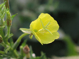 Evening Primrose, Oenothera biennis, native to eastern and central North America, a biennial with one to two-inch wide flowers that bloom in the evening and close by noon. Fragrance is somewhat like lemon. Keeps blooming through fall. Grows two to six feet high.