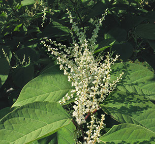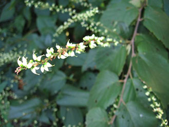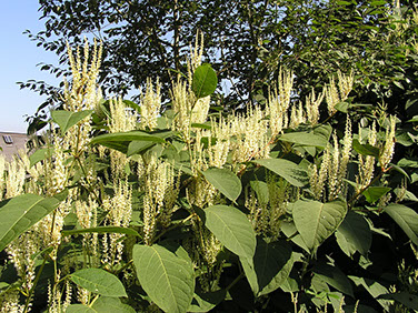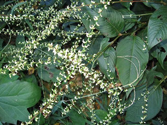Japanese Knotweed, Polygonum cuspidatum, syn. Fallopia japonica, is one of the worst invasive species in the world, according to the World Conservation Union. Not only does this perennial crowd out native species, its invasive root system and strong growth can block drainage chanels, damage foundations, buildings, roads, paving and retaining walls. It is native to east Asia. Blooms Ausust into fall.