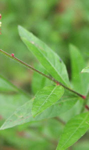 Pennsylvania Smartweed or Knotweed, Polygonum pensylvanicum, an eastern North American native, member of the buckwheat family. Smooth edged eaves about an inch long, pinhead sized buds in elongated clusters, tiny flowers. Major food source for birds. Blooms throughout summer. Also see Virginia Smartweed.