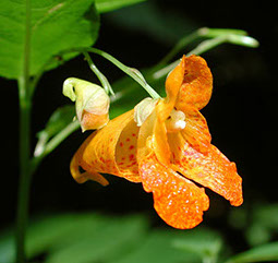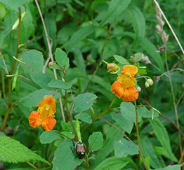 Jewelweed, Spotted Jewelweed, Orange Jewelweed and Touch-me-not are all names for Impatiens capensis, a native North American annual plant with juicy, glassy stems. Dermatological studies have confirmed that crushed jewelweed stems are effective in mitigating contact with poison ivy if applied after contact, followed by rinsing with water. Soap works better, but then few of us carry soap on day trips. Blooms late July into September in our region. May be almost all orange or almost all yellow. The similar Pale Jewelweed, Impatiens pallida, shown below, often grows side by side.