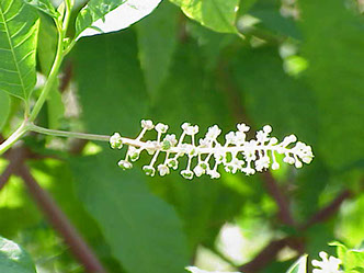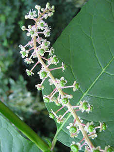 Inkberry or Pokeweed, Phytolacca americana, is a native to eastern North America, a perennial that dies back to the root each year, It has deep red stalks and can grow to 10 foot tall, and produces clusters of small white flowers in late July into August, and fruits into clusters of juicy purple berries from August into September. The plant is toxic, especially the roots, but the young leaves are sometimes eaten as boiled greens before the stalks turn red and toxins develop. Research is underway on the potential of the plant as a source of tumor suppressing and immune system boosting medications, and extracts are sold on the unregulated supplement market.