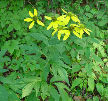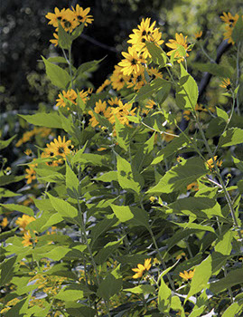 Jerusalem artichoke, Helianthus tuberosus, a perennial native to eastern and central North America. Long cultivated by American Indians before the arrival of Europeans, this plant is still raised commercially and the edible and tasty tubers sold as sunchokes or as Jerusalem artichokes, which are delicious raw or cooked. Grows up to 10 foot high. The flowers are similar to Tickseed Sunflower, Bidens aristosa, but the leaves are broad and the stems are branched and hairy.